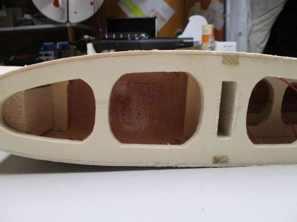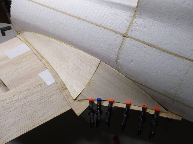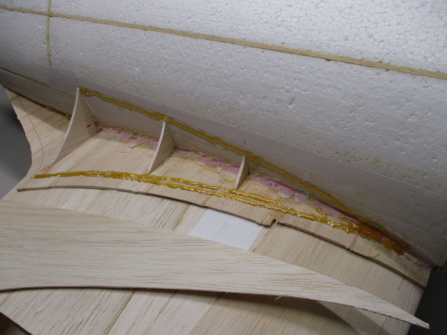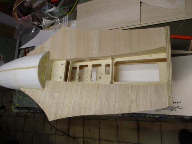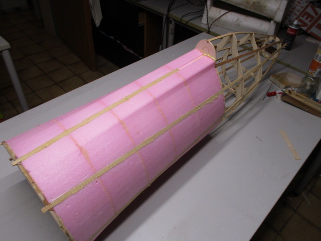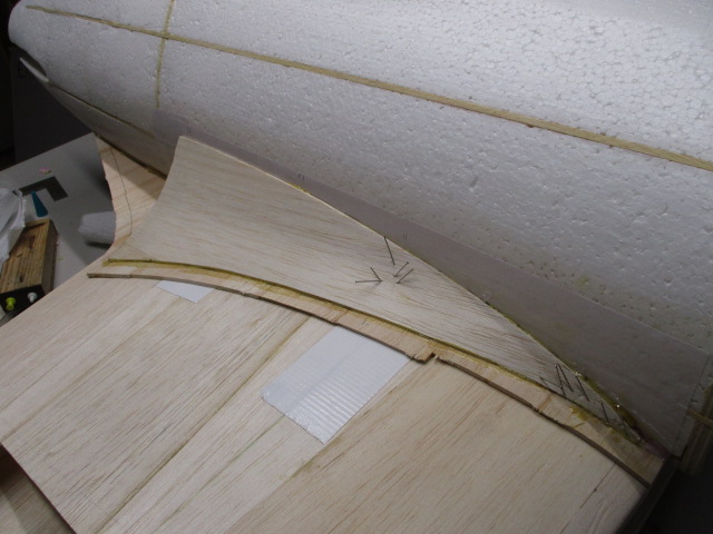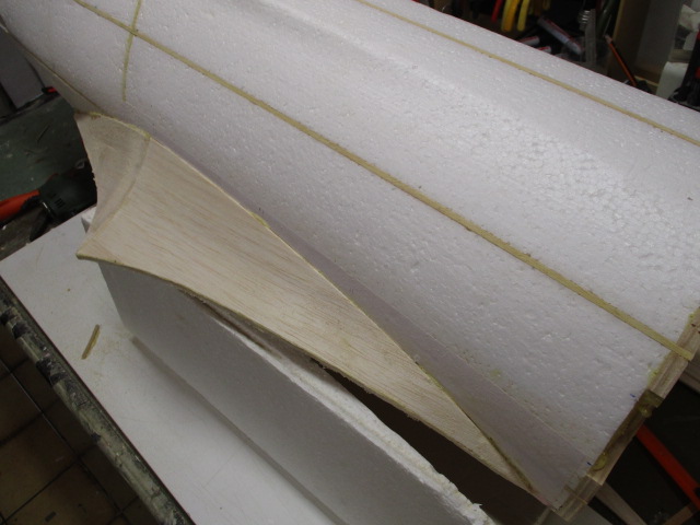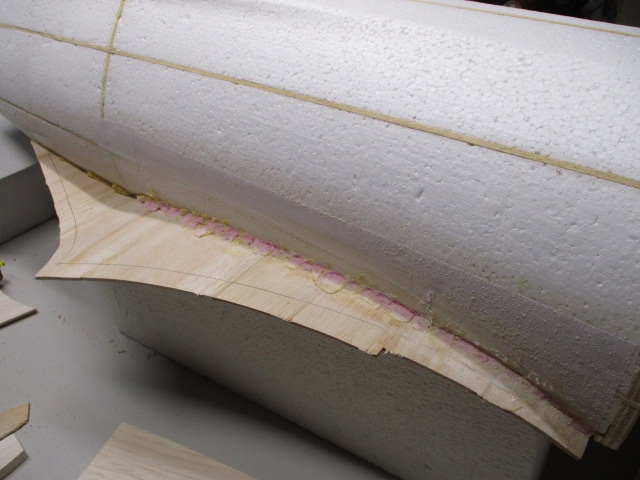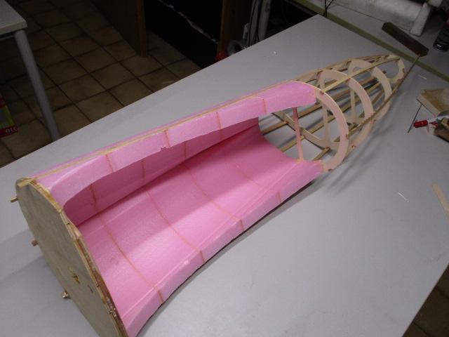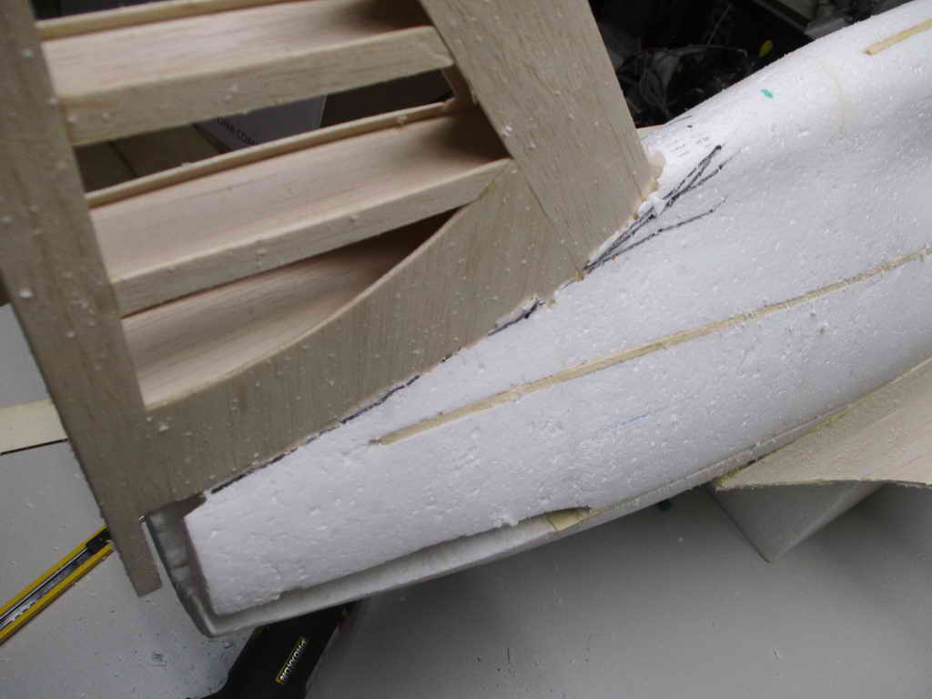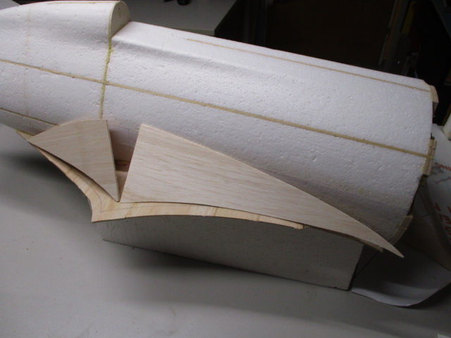 - zuerst wird die Auflage mit 3mm-Balsabrettchen eingeklebt ... dabei ist unbedingt die Tragfläche als Auflageschablone zu montieren ... sonst passt Fläche später nicht richtig ! - die Rumpfungenauigkeiten werden mit PU-Kleber und Styrodurkeilen aufgefüllt ... die obere Verkleidung besteht aus zwei Teilen - mit Hilfe von Stützrippen, Pu- bzw. Sekundenkleber werden dann die Verkleidungen verklebt und mittels Nadeln/Klemmen fixiert.