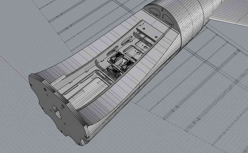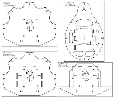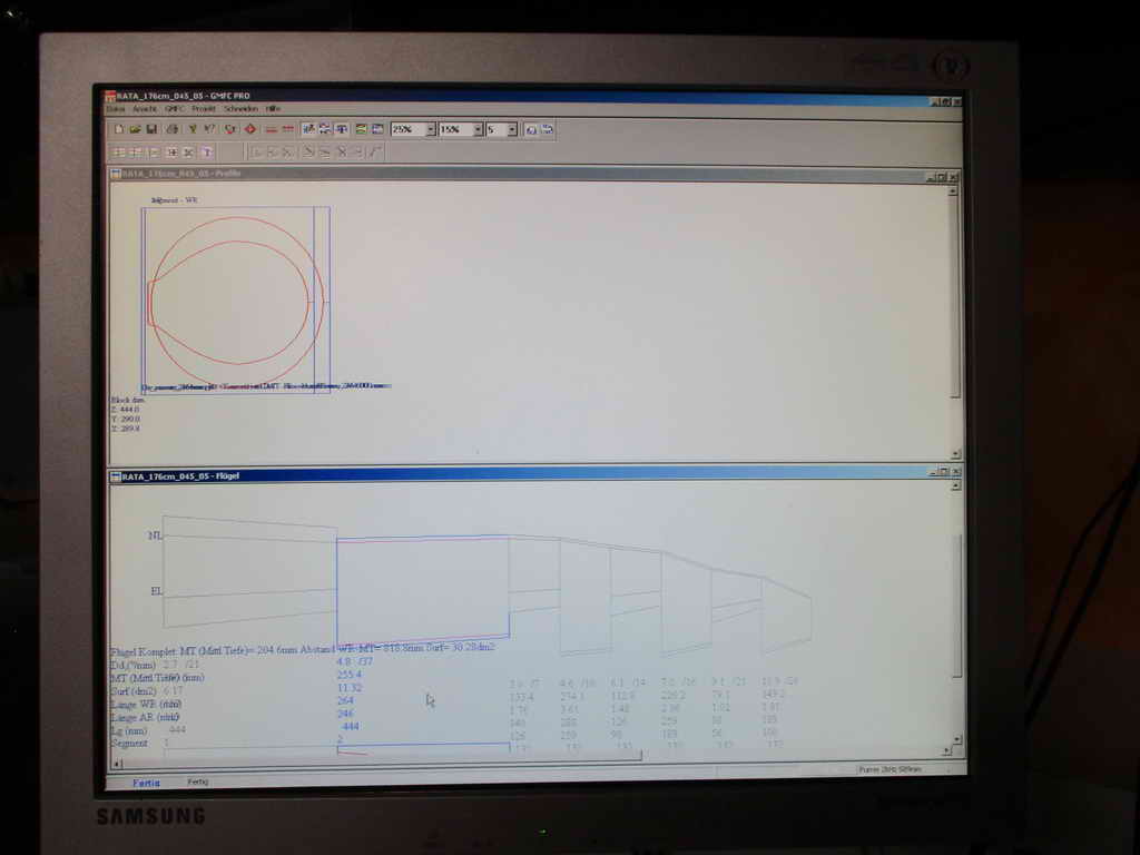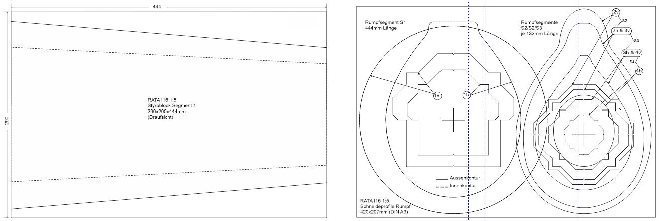 2.Konstruktion (176cm Spannweite) Dann wurde das Model auf Größe 1:5 bzw. auf eine Spannweite von 176cm neu konstruiert ... die Motorhaube hat dann immerhin auch noch 26,5cm Durchmesser. Der Rumpf wird mittels CNC-geschnittetem Styroporsegmenten und hölzernem 'Innenskelet' realisiert. Die Tragfläche, Leitwerke und Motorhaube werden ganz konventionell in Holzbauweise entstehen.. ... im CAD diente mir der auf 1:5 skalierte Plan der 2Meter-Rata von Jürgen Ide (von 1979 !) als grobe Konstruktionsvorlage ... ich habe also nicht alles neu erfunden ... wozu auch ? ... der Ide-Plan ist ja prinzipiell eine klasse Konstruktion. Somit hat man schon mal eine dem Original entsprechende maßstäbliche Grundgeometrie und dadurch spart man sich schon einiges an Konstruktionsaufwand.