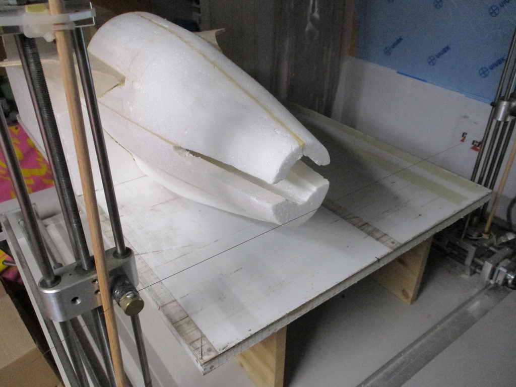 Nachdem die Schneideschablonen gezeichnet und 'gesynct' waren ... meine CNC-Styro-Freunde wissen sicher was ich damit meine ... ging's ans eigentliche Bauen des Rumpfes ... ... dann wwerden die Rumpfsegmente mittels Styro-CNC-Maschinchen geschnitten ...