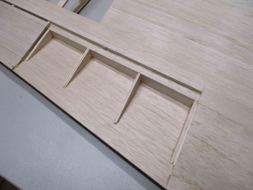 ... und wie schon beim Rumpfbau wird die Fläche vor dem Fräsen der Rippen virtuell zusammengebaut ... Etwas Aufwand hat man dann noch mit dem Einpassen der Fahrwerksaufnahmen bzw. der Fahrwerksschächte ... ist aber Aufrund der 'ordentlichen' Profildicke recht unproblematisch hinzubekommen. Der Flächenbau ist dann auch dank der fertig gefrästen Rippen recht zügig erledigt.