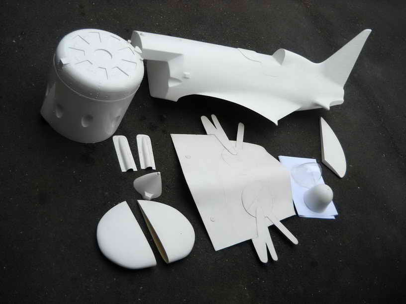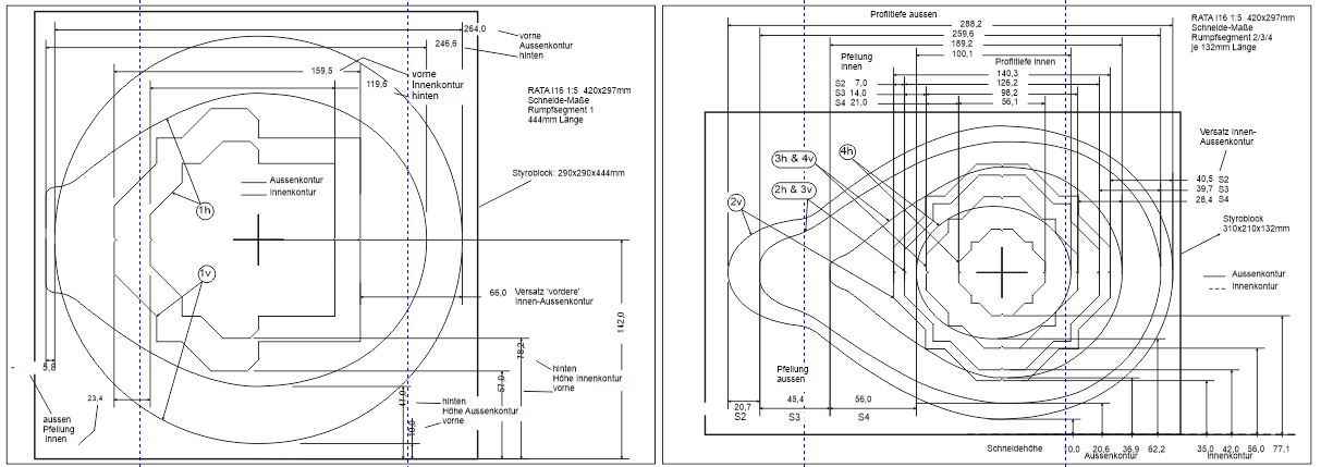 Rumpf Um die 'bauchige' Rumpfform des Originals auch im Modelle wiederzuerkennen entsteht dieser aus vier CNC-geschnittenen Styropor-Segmenten ! Die Vorgehensweise bei der Erstellung von CNC-geschnittenen Rumpfsegmente habe ich ja schon mehrfach bei anderen Modellprojekten beschrieben ...