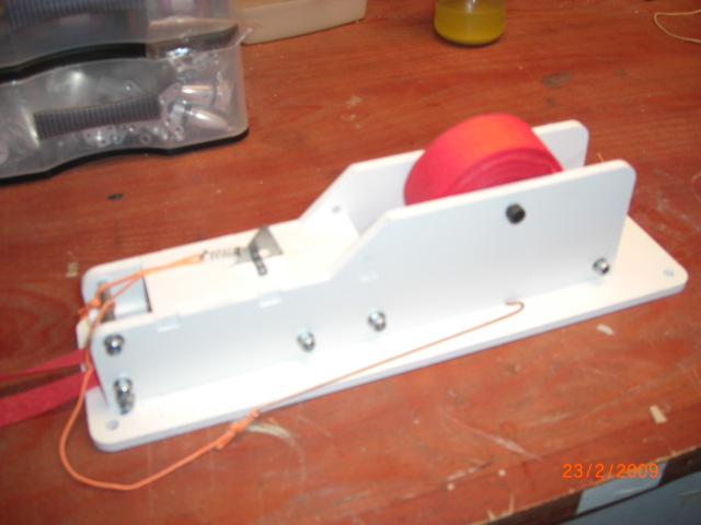 Die Schlitze für die Klinge habe ich nicht gefrässt, sondern mit einer schmalen Proxxon-Trennscheibe eingeschnitten. Die Klinge sitzt dann recht gut fixiert aber kann auch leicht herausgezogen werden ! Die Querschrauben sitzen jeweils in Aluröhrchen, welche auch den Abstand der Seitenwände zueinader beim Festziehen konstant halten. Wie auf den Bildern zu erkennen ist, wird die Klinge mittels einer 'angebundenen' Kugelschreiberfeder gehalten bzw. gespannt. Über das Funktionsprinzip brauche ich so denke ich hier nichts zu schreiben ... Rolle rein ... Klinge hoch ... Band durchfummeln ... Klinge runter ... vorne ziehen !!