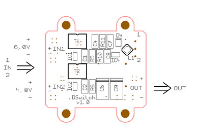 Speziell für eine solche Anwendung gemacht ist der LM5050 von Texas-Instruments ... ein sogenanter 'OR-ing FET Controller' ... ein IC welches zwei Spannungen vergleicht und im 'kleiner'-Fall die größere Spannung auf die kleinere aufschaltet ! Vereinfacht ausgedrückt: Mit zwei dieser IC's kann man zwei verschiedene Spannungsquellen 'verodern' ... also die Quelle mit der höheren Spannung wird durchgeschaltet ... hört sich doch perfekt an ! Da dieser Baustein als 'Schalter' einen externen MOS-FET (z.B. SIR440) treiben kann, sind den Stömen eigentlich auch keine Grenzen gesetzt ... der SIR440 kann über 30A Dauer !! Und ein genialer Nebeneffekt des externen MOS-FET ist seine 'interne rudimentäre' Diode, über welche selbst bei einem Ausfall des LM5050 weiterhin die Empfängerversorgung sicher gestellt bleibt !! typische Beschaltung:Als interne Spannungsüberwachung verwende ich den schon im AKMO bewährten PIC12F675 ... lediglich ein zusätzlicher LM2733-Boost-Regler garantiert eine zuverlässige Versorgung der Schaltung, da der LM5050 +12V benötigt ... bzw. dadurch ist auch eine Verwendung in 1SLipo-Systemen denkbar !!