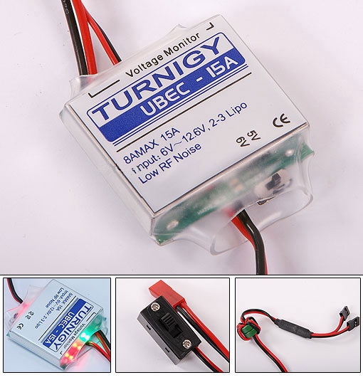 ... im Nutzen war's billiger ! Für die Hauptversorgung der Fury erfolgt aus einem 3S3300mAh-Lipo, welcher ein TURNIGY-8-15A-UBEC 'antreibt' ... dieses BEC kann mit 2 oder 3 Lipos gespeist werden und kann Spitzenströme bis zu 15A bringen ! Ich weis ... da schreibt er von höherer Zuverlässigkeit und dann kauft er in Fernost ein ... aber dieses BEC hat es in sich und steht den anderen bei uns angebotenen Produkten bestimmt in nicht's nach ... super gelötet - auch unter der Alu-Dose ... Restwelligkeit unter Vollast (15A) kleiner 0,5% (>30mV~ !!!) ... Dauertest 8A (über Stunden) keine Problem ... Peak-Ströme von 15A (On/Off - 3s/10s) im Dauerbetrieb kein Problem ... auch bei 'aktiven' Lastwechseln keine Spannungeinbrüche ... die leitungsgebundenen Stör-Emmissionen liegen auch im absolut vertretbaren Bereich (der Ferrit im Ausgang muss drin bleiben), da sind die Motor-Steller-BEC's um einiges schlechter ... ... lediglich der EIN-Schalter macht einen etwas 'billigen' Eindruck, aber den verwende ich eh nicht !