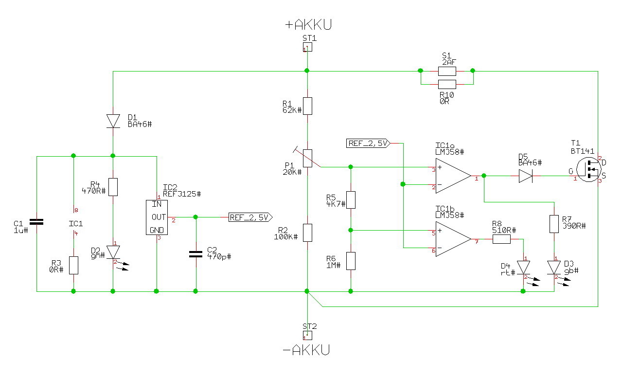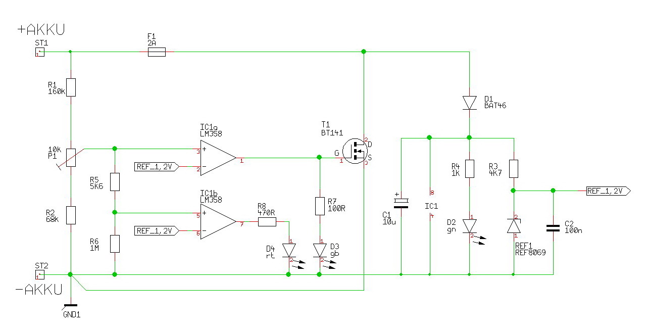 Über den Spannungsteiler wird die Zellenspannung mit der Refernz verglichen ... wird diese am +Komparatoreingang überschritten kippt der entsprechende Ausgang in's positive und der Transistor wird leitend ... dies hat zur Folge, daß ein Teil des Ladestroms über den Transistor um dieZelle herumgeleitet wird und diese nun langsamer weitergeladen wird. Dieser 'Umleitstrom' nimmt mit zunehmender Zellenspannung immer weiter zu, so daß die Zelle nicht überladen werden kann !! Der zweite Komparator kippt erst beim Überschreiten einer 'Fehlerspannung' und bringt die rote LED zum Leuchten ... dann liegt aber ein Fehler vor und der Ladevorgang muß sofort abgebrochen werden !!