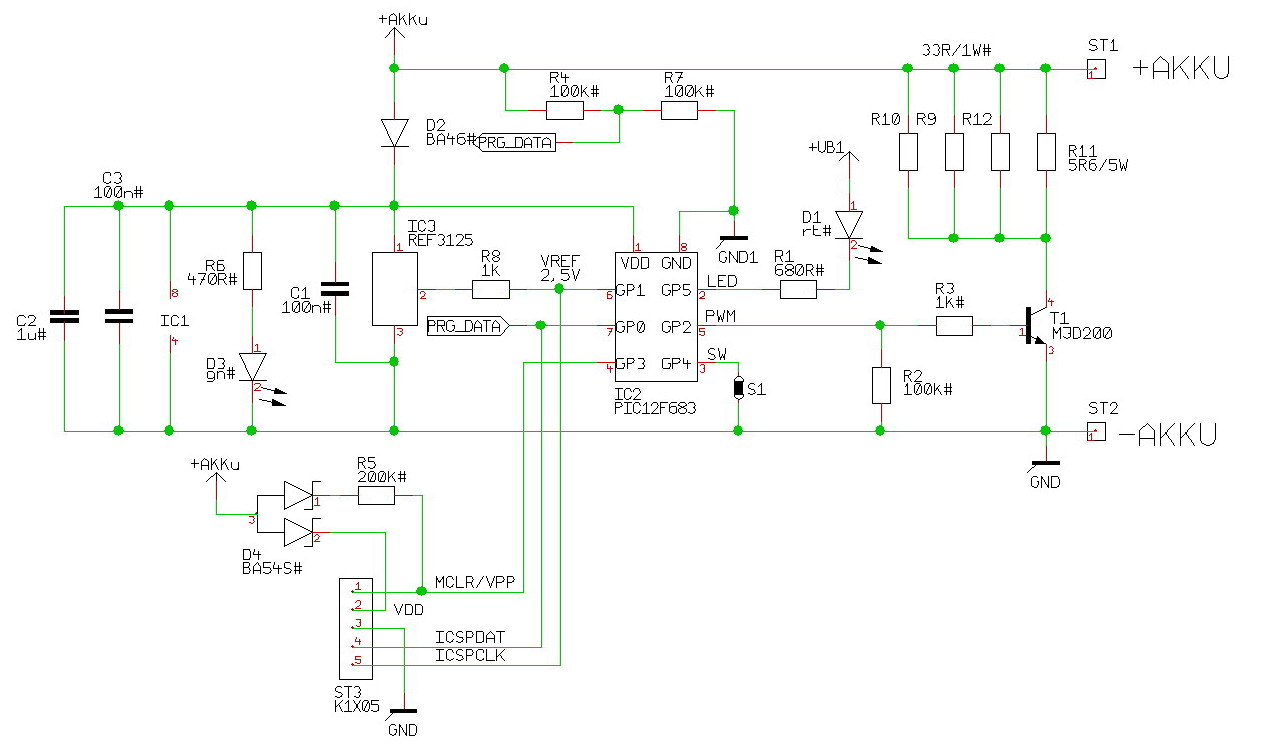 und noch einer mit nem PIC-uController ...Hier überwacht ein PIC12F683 die Zellenspannung und bringt über eine PWM-Signal den 'Umleittransistor' bei Bedarf in Aktion. Auch hier meldet sich eine rote LED im Fehlerfall. Die 5-polige Stiftleiste dient zum Programmieren und Debuggen des PIC's, ohne diesen Ausbauen zu müssen (ICSP-Schnittstelle).