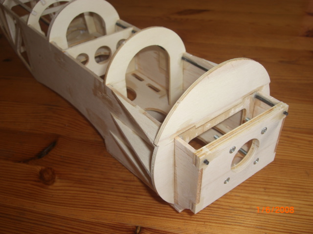 ... das Rumpfvorderteil habe ich mittels Holzplatten fixiert und verklebt ... zu sehen sind auch die 2mm-CFK-Rumfgurte