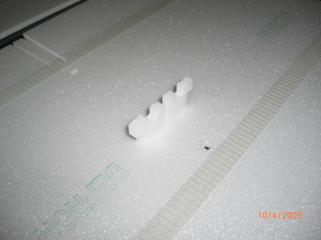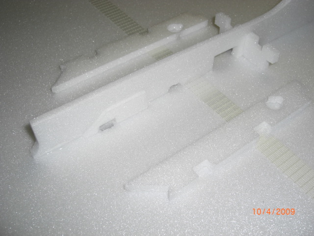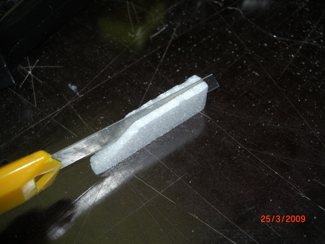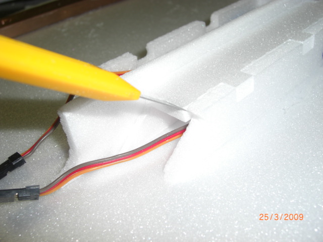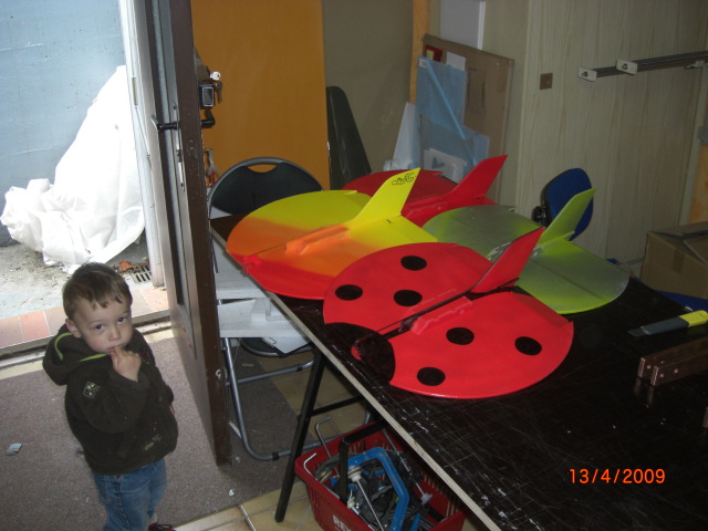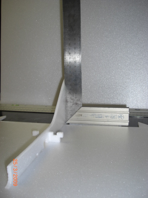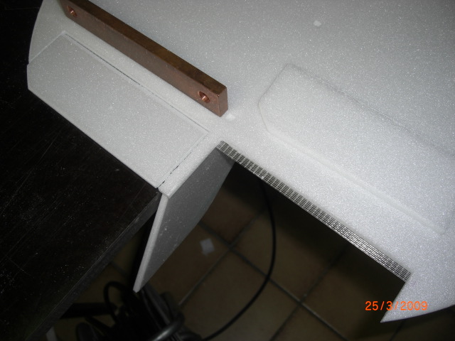 ... mein Maschinchen bei der Arbeit Da man verwöhnt werden möchte, sind alle Teile ineinander vezapft, wodurch der Zusammenbau auch 'planlos' möglich ist ... einfach ein bischen mitdenken. Um einem Verzug vorzubeugen, sollte der Bau auf einer planen Platte erfolgen, wobei man die Fläche mit Gewichten etwas beschwert. Bauschritte: - Depron zuschneiden frässen und Einzelteile auspopeln - (1) alles mal zusammenstecken .... schauen ob's past ... evtl. hierbei 'mitdenken' - Fläche / Rumpfteile an Außenkanten mit Schleifpapier abrunden ... ein bischen Aerodynamik kann halt doch nicht schaden ! - (2) Ruder abschrägen und mit Tesa/Tape auf Oberseite anschlagen ... hierbei das Tesa/Tape über die ganze Breite der Fläche ziehen - (3) Flächenvorderkanne im 'Kollissionsbereich' mit Tesa/Tape umkleben ... Freaks können im geraden Nasenbereich auch ein 2mm-Kohlestab aufkleben ... - (4) Leitwerks- bzw. Rumpfoberteil senkrecht ausrichten und aufkleben .... Achtung: die Rückwand der RC-Verkleidung muß vorher mit eingesteckt sein ! - (5) Servos mit Hilfe der Verkleidungseitenteilen ausrichten und aufkleben ... diese evtl. vorher einschrumpfen !! - (6) Verkleidungseitenteilen ausrichten und aufkleben - (7) Deckelauflage (Keil) mit Klingenmesser der Länge nach 'halbieren', am Seitenteil vorne ausrichten und einkleben - (8)Vordere Deckel und Oberteile einpassen ... diese sind entsprechend mit Klingenmesser abzuschrägen. - Vordere Deckel mit Oberteil ausrichten und einkleben. Achtung: Oberteile nicht festkleben ... diese bleiben nur geklemmt ! - vorderes Rumpfteil ausrichten und festkleben - (9) ein 15cm langes 2mm-Kohlestäbchen nun oben auf den Rumpf aufkleben und mit Tesa/Tape noch fixieren ... dient später als Akkubefestigung. - (10) Die oberen beiden Motorbefestigungen plan mit Nasenkante ausrichten und mit Fläche/vorderem Rumpfteil verkleben - (11) Fläche umdrehen und im Ruderbereich / Flächemitte evtl. mit Tesa/Tape verstärken ... ein 'Kann' ... muß aber nicht ! - (12) Fläche und Rumpfunterteil senkrecht ausrichten und aufkleben .... der vordere Bereich wird unten mittels einem 2mm-CFK-Stäbchens (ca. 17cm) verstärkt ! - (13) an entprechender Position die Ruderhörner (2x 25mm Kohlestäbchen) in die Ruder einkleben ... unten leicht rausschauend und flächig verklebt ! - (14) Anlenkung/Schubstanken werden abgelängt und mittels Schrumpfschlauch und Sekundenkleber fixiert. - wer will kann nun noch Farbe aufbringen - (15) Die Motorbefestigungen ausrichten und verkleben ... evtl. leichten Sturz einplanen ... Motor/Propeller befestigen, Regler verlöten/fixieren und Kabel verlegen - (16) Empfänger wird in eine Kabinenseite eingebaut .... als Kabelstauraum kann die zweite Seite benutzt werden. - Antenne verlegen und Deckel drauf, dieser sollte man noch etwas mit Tesa fixieren ... die Kanten der Kabine kann man bei Bedarf noch etwas abrunden ... - (17) Der Akku wird unter das Kohlestäbchen geklemmt und evtl. mit einem Streifen Klettband fixiert. - (18) An Farbe können Baumarkt-Billig-Sprühdosen verwendet werden .... aber bitte vorher auf Depronverträglichkeit testen !! Der Schwerpunkt sollte bei ca. 25% (+/- 1cm) liegen. Bilderfolge: (1)
