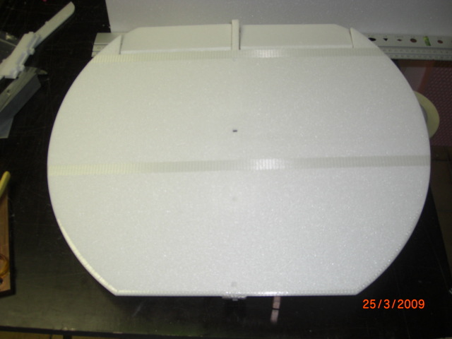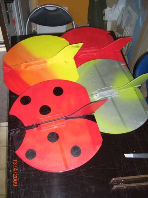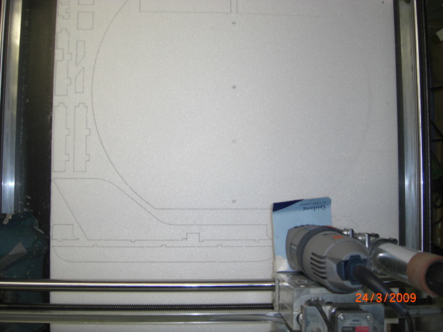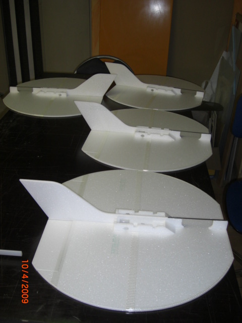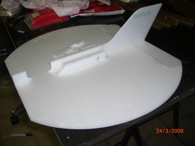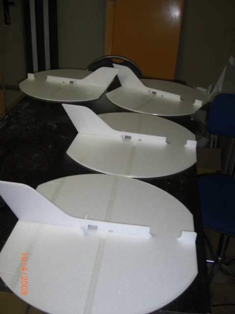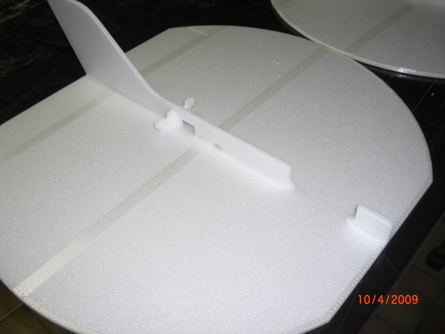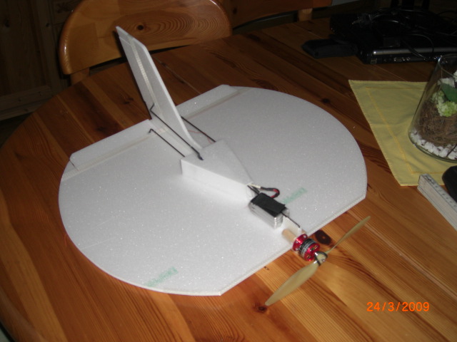 ... mein Antrieb liegt bei 65gr. ... könnte noch leichter sein !! Bei der Auswahl der RC-Komponenten reicht kleckern ... nicht klotzen ... weil schwer fliegt schwer ... leicht fliegt halt leichter. Wobei aerodynamisch bedingt man hier eigentlich nicht von fliegen sprechen kann .... 'Hummeltechnisch' eher auf einem Luftpolster schwebend ... kommt aber auf das gleiche heraus --> leichter auch besser ! Das Fluggwicht sollte die 200gr.-Marke nicht zu gravierend überschreiten ... aber schauen wir mal ! Noch kurz erwähnt sei, daß trotz der Einfachheit des Fliegers im Aufbau, eine gewisse Flugerfahrung mit wendigen Modellen vorhanden sein sollte. Als Durchmesser wurden 50cm gewählt, da in dieser ich in dieser Größe schon mehre Konstruktionen ordentlich fliegen sah. Vorne und hinten wurde die Scheibe etwas begradigt, die Querruder bekamen eine Tiefe von 5,5cm ! Da ich eine schicke CNC-Frässe mein Eigen nenne darf, wurde das Fliegerchen fluks am PC gezeichnet und auf dieser aus 6mm Depron ausgefrässt. Zeitlich sicherlich aufwendiger als mal schnell mit dem Klingenmesser ein Scheibchen 'ausgepopelt' ... aber sicherlich wollen später die netten Kollegen auch sowas haben und dann ....