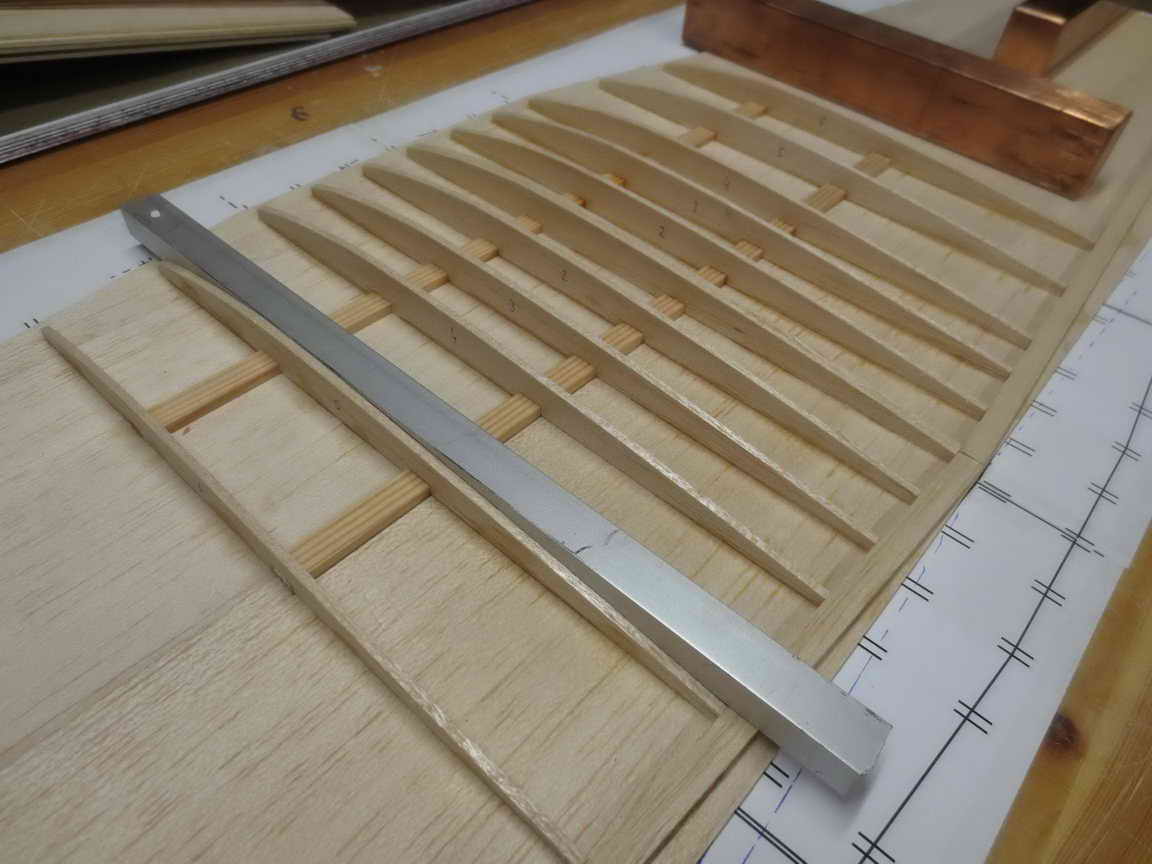 ... die Holmgurte + Rumpfverstärkungen werden vorab 'plan' augeklebt ... dann kommen die 'senkrechten' Spanten