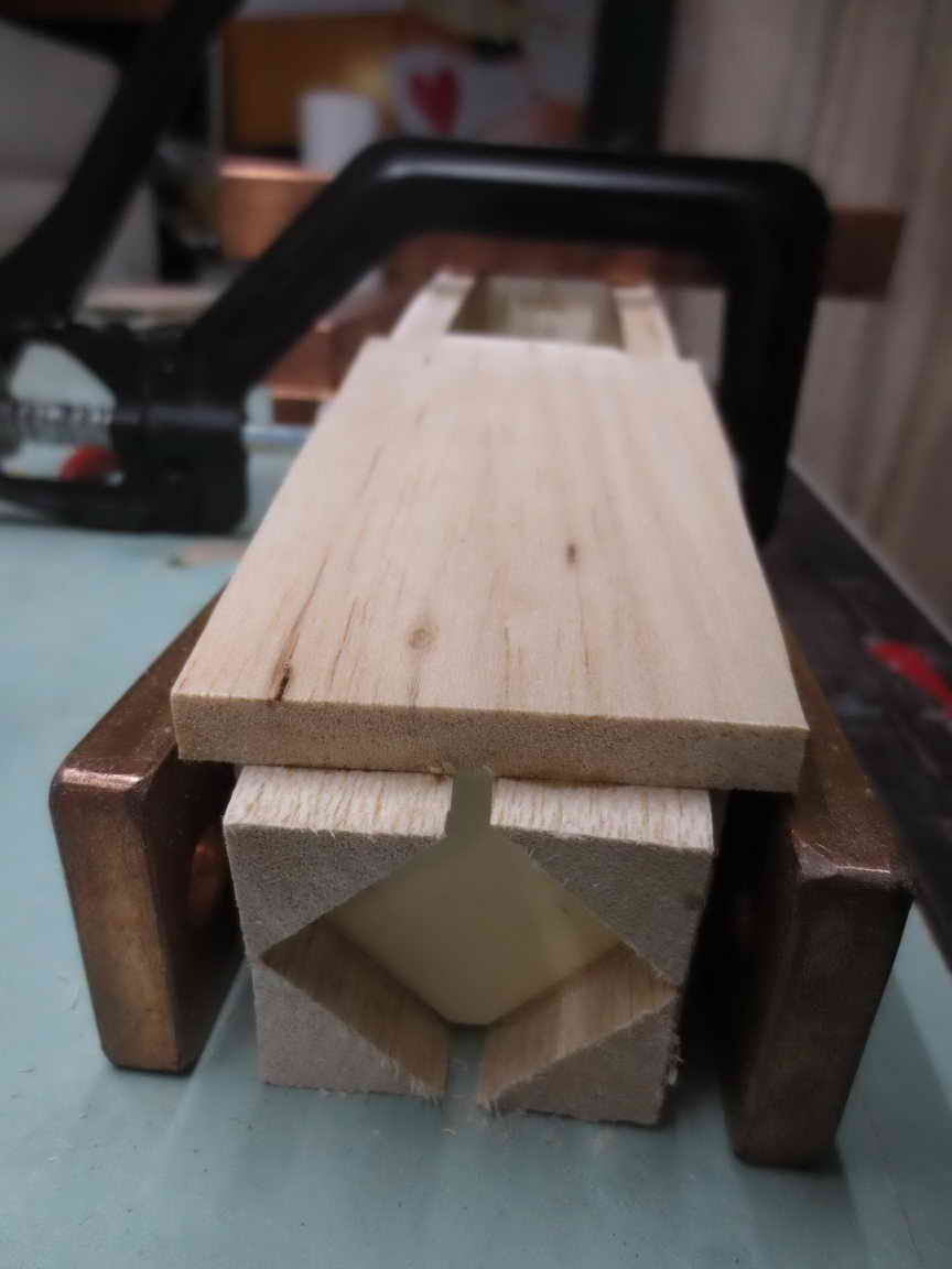 ... dann folgt die Heckverklebung mit dem entsprechenden End-Spant + den 20mm-Dreiecksleisten + 8mm Bodendeckel ...