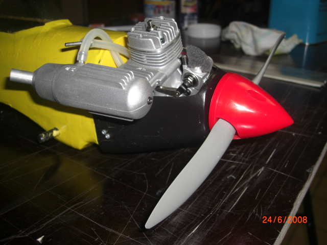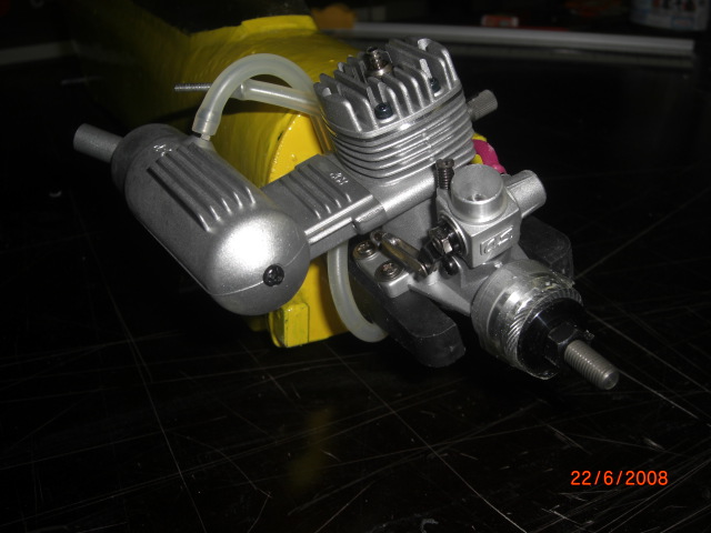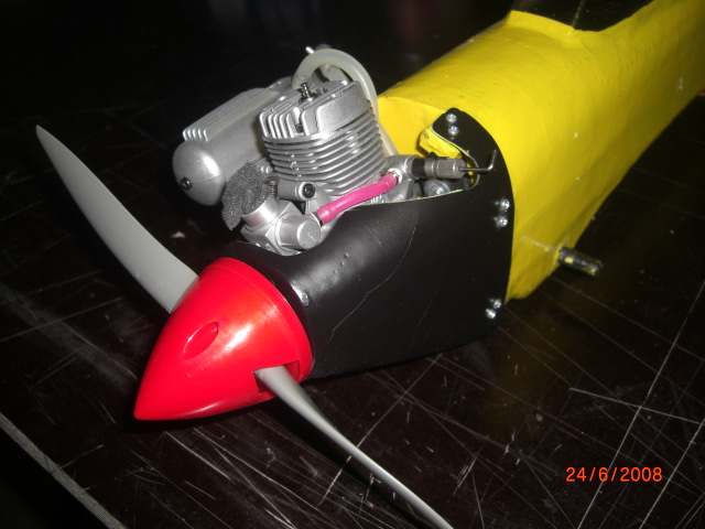 ... noch ein bischen zu 'stabil' , aber passt !! Da ich in der Elektro-Fraktion zum Aircombat gekommen bin wollte ich nun mir den direkten Vergleich zur 4ccm-Verbrennerversion nicht entgehen lassen ... also musste ein V-Version her. Zwei meiner vier gebauten Battle-Rümpfe werden nun noch mit 4ccm-Motoren (OS-MAX 25FX) ausgerüstet ... hierzu wurde einfach ein zusätzlicher 3mm-Sperrholzspannt (mit passenden Motorträgerbohrungen) auf die 'E-Version' aufgeklebt und im Rumpfinneren ein Tank (100ml),ein Gasservo und Empfängerakku (4x KAN650mAh) mit Schalter/Ladebuchse eingebaut !