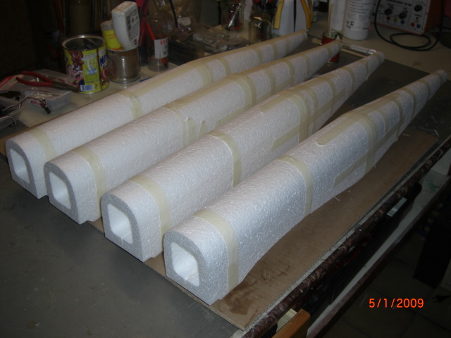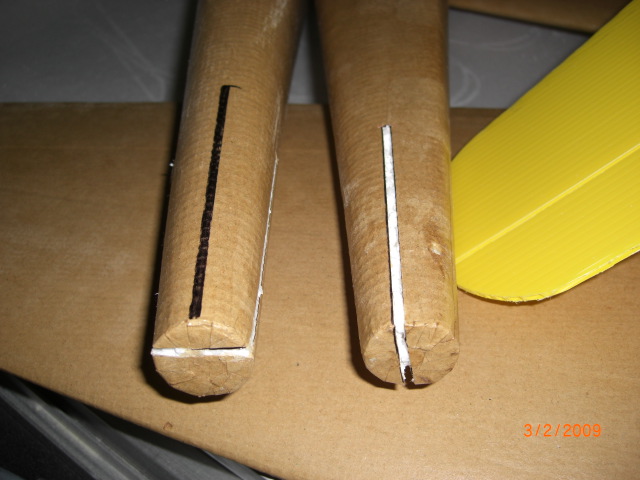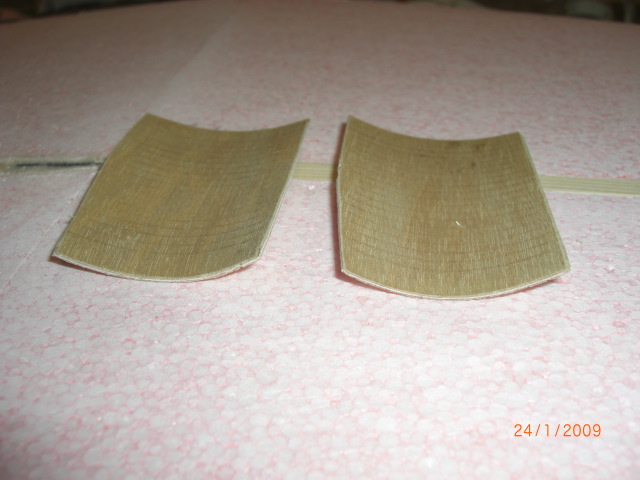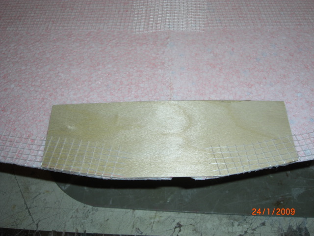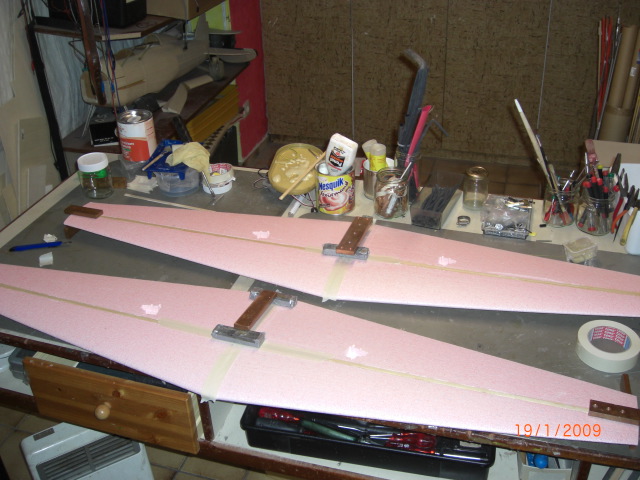 Die Flächenhälften bekamen noch eine schmale 2,5mm-Schlitz mittels Kreissäge direkt in die 8mm breiten Holme für vier 3mm Kohlefaserstäbchen (je 50mm lang) ... dann wurde diese entsprechend gewünschter V-Form zusammengeklebt ... Die Verstärkungen im Auflagebereich an der Flächenunterseite machte ich aus 1,5mm Sperrholz, welchen ich mit Wasser und einer Blechdose den benötigten Nasenradius verpasste !!