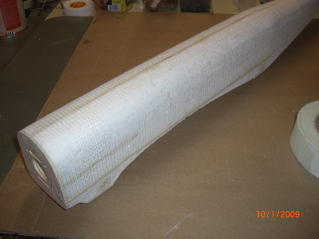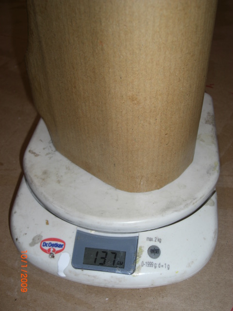 Dann wird der Rumpf noch etwas verschliffen, an verschiedenen Stellen mit Fugengitterband verstärkt und mit Packpapier bespannt ... Übung macht hier den Meister ... ich bin noch am üben !! Der Rumpf wird mittels Schaumrolle mit Parkettlack (wasserlösliche Version !!) eingepinselt, das vorher zugeschnittene Packpapier wird ebenfalls (einseitig) berollt (kurz Quellen lassen) und dann möglichst glatt auf den Rumpf aufgebracht. Vordere und hintere Rumpfhälfte sollte man getrennt beschichten ... geht besser !! Die Ränder werden bei Bedarf eingeschitten und ca. 15 bis 20mm umgelegt. Den ganzen Rumpf am Schluß nochmals einpinseln ... das gibt eine recht glatte und feste Oberfläche !! Nachdem alles durchgetrocknet ist sollte sich die Oberfläche gespannt und die evtl. vorher vorhandene 'Falten' entfernt haben ... aber eben nur 'sollte' !! Ein Vergleich des Rumpfgewichtes der Bauschritte zeigt das Mehrgewicht der zusätzlichen Verstärkungen auf ... so ca. 30 bis 40g !
