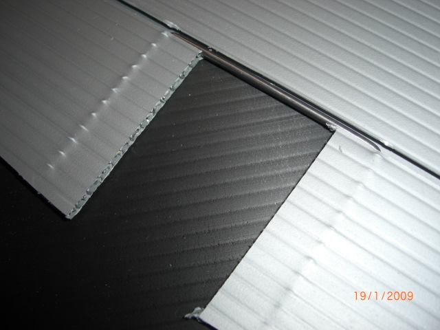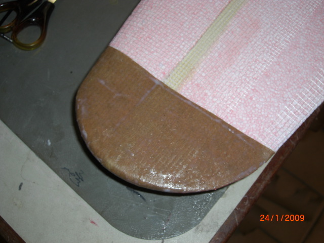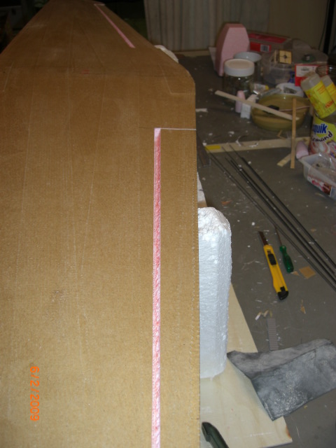 ... mit dem Randbogen habe ich begonnen ... dann Oberseite mit Umschlag ... Unterseite (ohne Umschlag) zum Schluß Nachdem die beiden Flächenhälften 'verschliffen', verklebt und 'eingepackt' waren wurden die Querruder ausgeschnitten .... die obere 'Bespannung' dient hierbei als Scharnier und wurde dementsprechend nicht durchgeschnitten !! Mit dem Lötkolben, einer feinen Spitze und einem Lineal kann man optimal die 'Schräge' ausschmelzen !