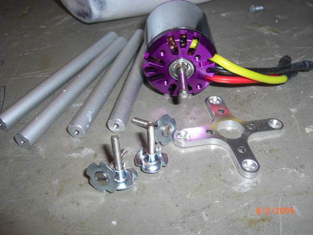 Hier sieht man alle vorbereiteten Komponenten ... ... Alustäbe mit M3 Gewindebohrungen, M3 Einschlagmuttern mit eingedrehten M3'er Schrauben, Motor (hier C3548/1100) inkl. Befestigungskreuz.