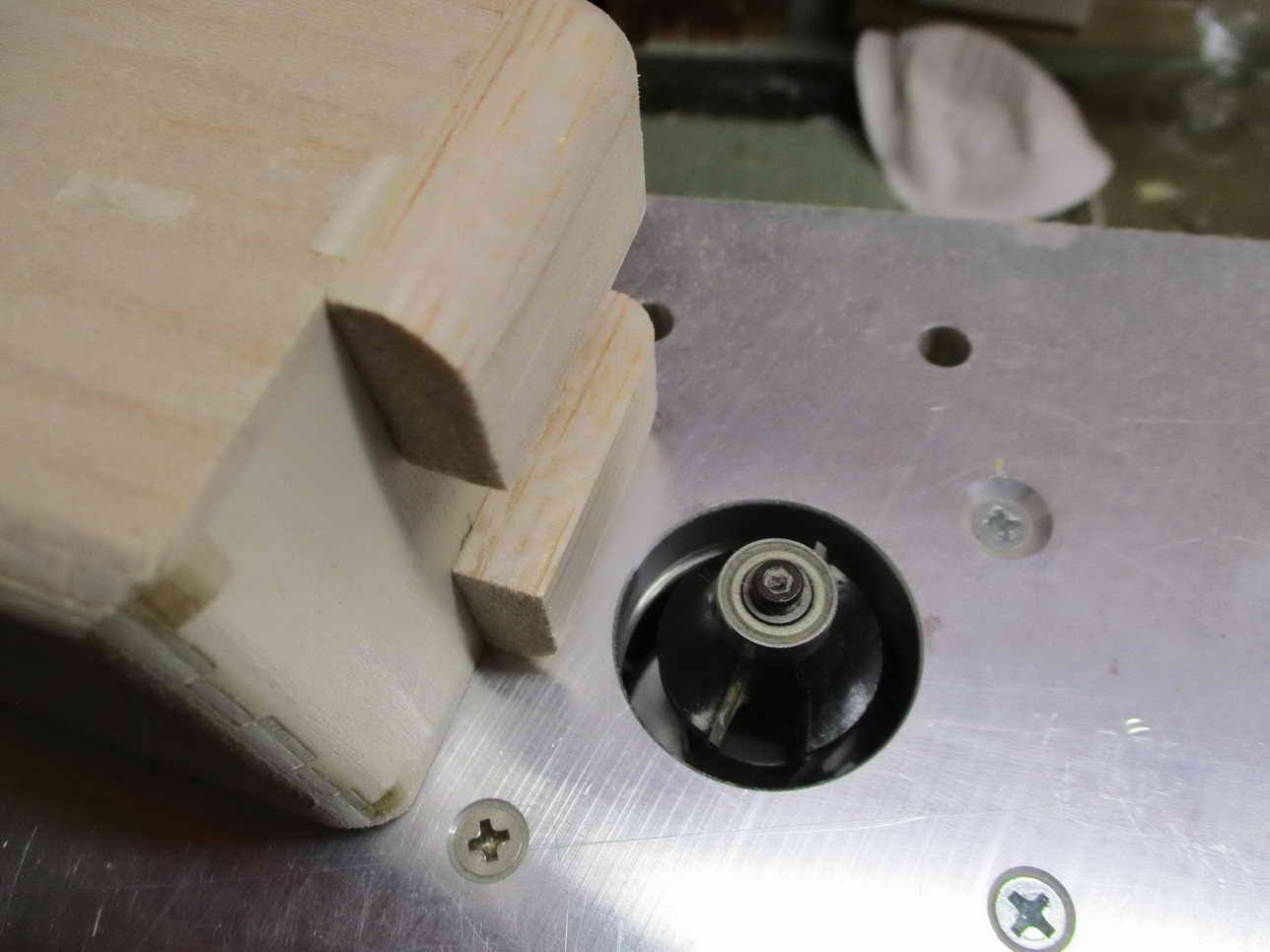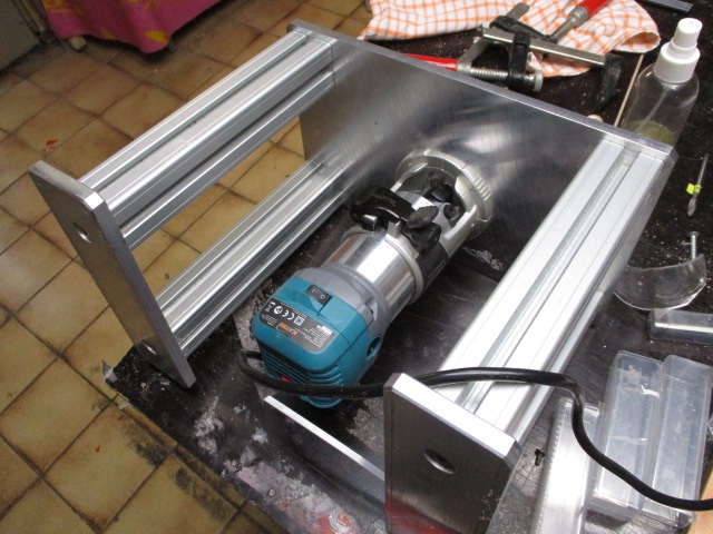 ... von oben mit montiertem Maschinchen ... ... links ein simples Aluprofil als einstellbarer Anschlag für nicht 'gelagerte Fräser ...