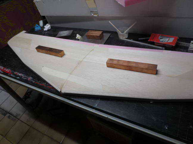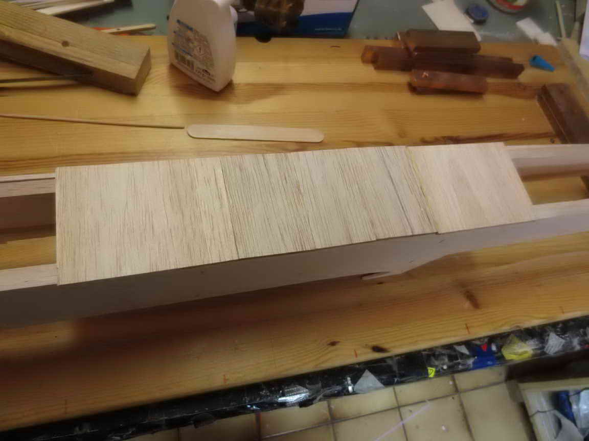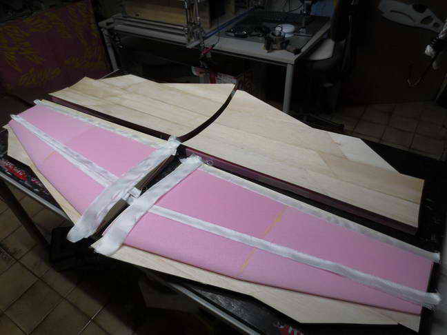 ... nach dem Aufkleben der Wurzelrippen werden die Flächenhälften noch zusammengeklebt und die Beplankung zugeschnitten ...
