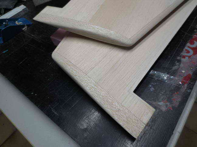 ... das Leitwerk entsteht aus zwei 'gegengemaserten' und verklebten 3mm-Balsabrettchen ... ich habe noch zwei 80gr-Matten dazwischen gelegt ... geht aber sicherlich auch ohne, oder man 'presst' wie bei meinem 1. Brett einfach beim Verkleben ein 3mm-Kohlestäbchen mit rein !![]()