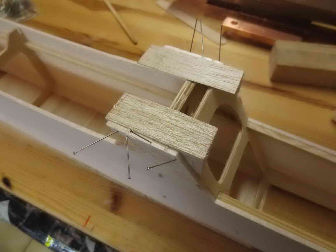 Rumpf: ... der prinzipielle Bau des Modells ist natürlich nahezu identisch zu meinem großen Turbinenbrett, deshalb wird hier der Bau auch nur noch grob beschrieben ... ... mir dem Heckausleger wird begonnen ... die Zahnstocher dienen zur Montagehilfe/Zentrierung der Einzelteile ... während dem Aushärten des Klebers ordentlich 'Planpressen' ;-)![]()