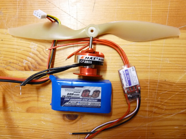 Motorisierung: FC28-22 / FC28-05 ... High-Torque 280/5 … Typhoon 6-3D … AHM 23-5 … ELE EC28P-L … o.ä. Propeller: 7x4 bis 8x5 je nach Motor ... 30Watt mehr als ausreichend ... bei 3S ca. nur ca. 4A !