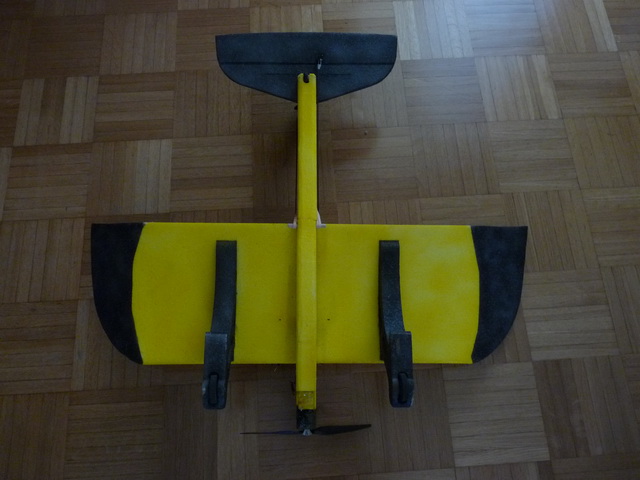 ... als Achse reicht ein 2mm CFK-Stäbchen ... wer auf Asphalt landet/startet kann am Heck noch ein Rädchen einbauen !