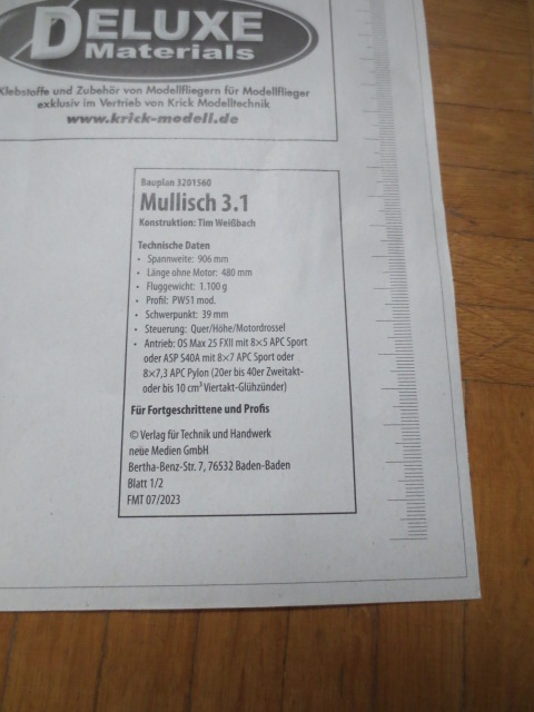 Wie kam's dazu ? Bei unserem diesjährigen (2024) AirCombat-Wettbewerb beim MSC-Oberhausen sah ich bei den Pylon-Piloten ein sehr interessanten und vor allem genial flotten + wendigen Nurflügel seine Pylon-Runden drehen. Nach Rückfrage bei den 'Kringelfliegern' konnte ich den Namen und den Ursprung des Modells heraus bekommen." ... das ist der Mullisch von Tim ... das ist der, der da drüben rumsteht ... der hat den konstruiert ... " Da hab ich mich doch gleich mal beim Konstrukteur 'drüber' schlau gemacht ... ;-) Der von Tim konstruierte Nurflügel wurde im FMT 07/23 veröffentlicht, entspricht den offiziellen Regularien des Pylon-Cup's und kann mit 4cc (Sportklasse) oder 6,5cc (Unlimited) geflogen werden. Regelbedingt ist es eine sehr einfach gehaltene und 'kantige' Sperrholzkonstruktion ... zumindest bis auf die Flächenbeplankung und den Rippenkämmen scheint so ziemlich alles aus Sperrholz zu bestehen.