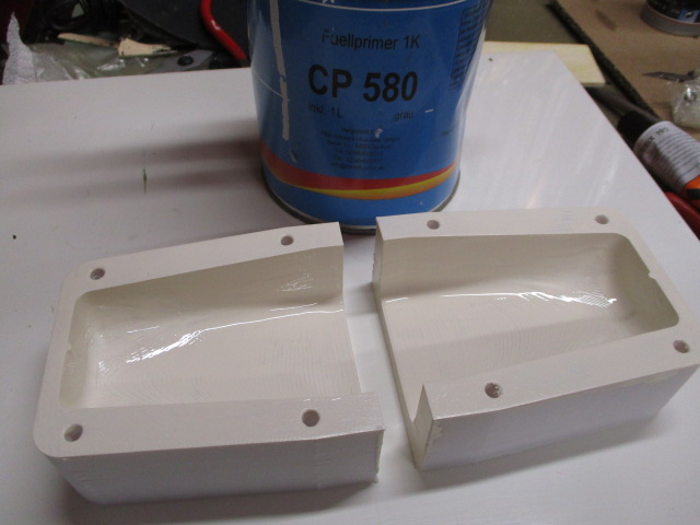 Eine Motorhaube für den Mullisch entsteht ! ... ist mit Haube zwar nicht mehr Pylon-Regelkonform, sieht aber einfach schicker aus und etwas Speed wird's auch noch bringen ... Haube ist aber für ne Teilnahme am Wettbewerb auch gleich abgeschraubt ! ... hier die Arbeitsfolge passend zu den Bildern - im 3D-CAD entsteht virtuell die Urform und die beiden Formhälften ... natürlich mit Löcher für Formstifte - die beiden Formhälften werden gedruckt ... PLA mit 20% Füllung und 3 Lagen Wandstärke ist vollkommen ausreichend - zweimal einpinseln mit 1k-Füller ... der haftet sensationell auf PLA und lässt sich wunderbar schleifen - gründlich Nassschleifen mit 1000'er Papier - 2x fett mit Trennwachs 'einwichsen' ... trocknen lassen und polieren - die vier Formzapfen kommen rein ... hier 5mm Kunststoffröhrchen - nach dem Zusammenfügen der Formhälften kommt noch Folientrennmittel rein ... sicher ist sicher - innen dünn mit tixiertem Harz (Gelcoat) einpinseln und dann 2 Lagen 160'er (o.ä.) Gewebe einlegen - nach dem Aushärten vorsichtig mit Pressluft die Haube aus der Form trennen - die Haube entsprechend benötigter Länge zuschneiden - mit Hilfe des später verwendeten Spinners (hier 30mm Durchmesser) die Motoraussparung ausarbeiten - zur Befestigung der Haube werden noch 3 Hartholzklötzchen am Motorspant verklebt und verlackt - die fertig bearbeitete Haube bekommt dann ihre Farbe - Fertiggewicht gerade mal 12 Gramm ... - dranhalten, ausrichten, Löcher für 2mm Holzschrauben bohren, festschrauben - fertig![]()