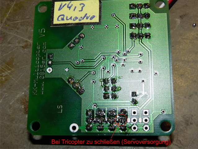 ... bei Tricopterversion ist die markierte Lötbrücke zu schließen --> +5V-Heckservoversorgung !