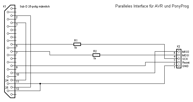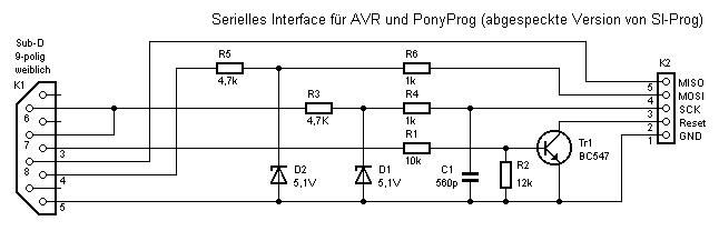Mit einer dieser beiden oberen Schaltungen kann man in Verbindung mit der Programmiersoftware PonyProg über den 6-poligen Stecker